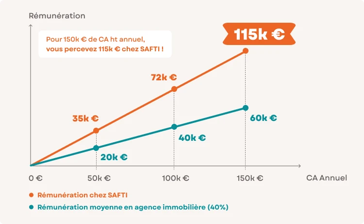 SAFTI propose un système de commissionnement avantageux basé sur vos ventes, allant de 70% à 100% des honoraires d’agence que vous générez. Plus vous vendez, plus vous gagnez !